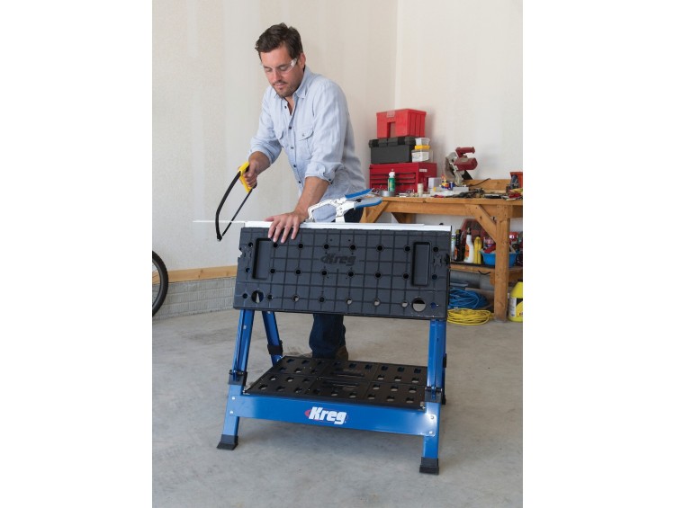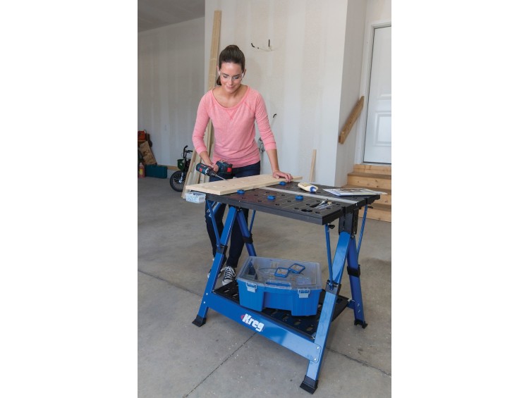 El Centro de proyectos móvil proporciona un espacio de trabajo portátil que se puede utilizar para una amplia variedad de tareas. La abrazadera Trak y la abrazadera de banco incluida con tecnología de ajuste automático Automaxx® brindan múltiples formas de sujetar piezas de trabajo. Las mesas abiertas pueden soportar hasta 158 kg y tienen bandejas de almacenamiento integradas, soportes para su taladro y mucho más. Un estante debajo sostiene hasta 11kg de suministros y herramientas fuera del camino, pero a mano mientras trabaja. Además de ser excelente para el uso general de proyectos, el Mobile Project Center es perfecto para uniones Kreg®. Ya sea que esté perforando, sujetando gabinetes o marcos frontales juntos, o preparando su proyecto para el ensamblaje final, el Mobile Project Center hace que las uniones Kreg® sean aún más fáciles de realizar.
