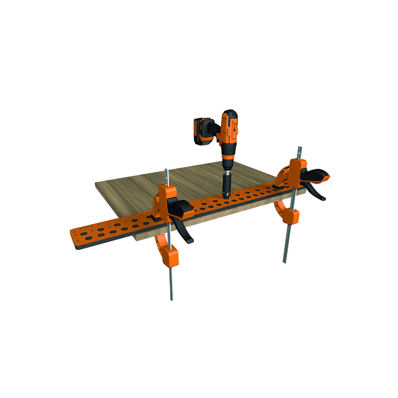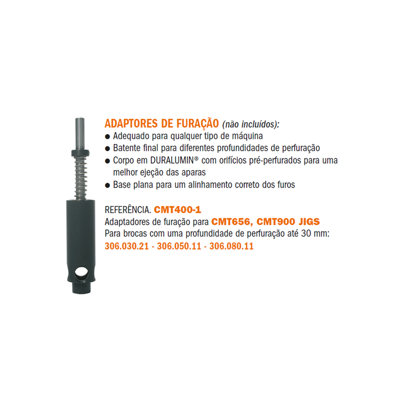 O Guia universal para furações da CMT foi concebido para efetuar a perfuração manual com precisão e produtividade de elementos de mobiliário, obtendo furos com a distância entre eles de 32 mm. Para perfurar suportes de prateleiras com 3 mm ou 5 mm de diâmetro e para efetuar e marcar orifícios para dobradiças. Este acessório CMT900 vai ajudá-lo a pré-furar os tipos de dobradiças mais populares.