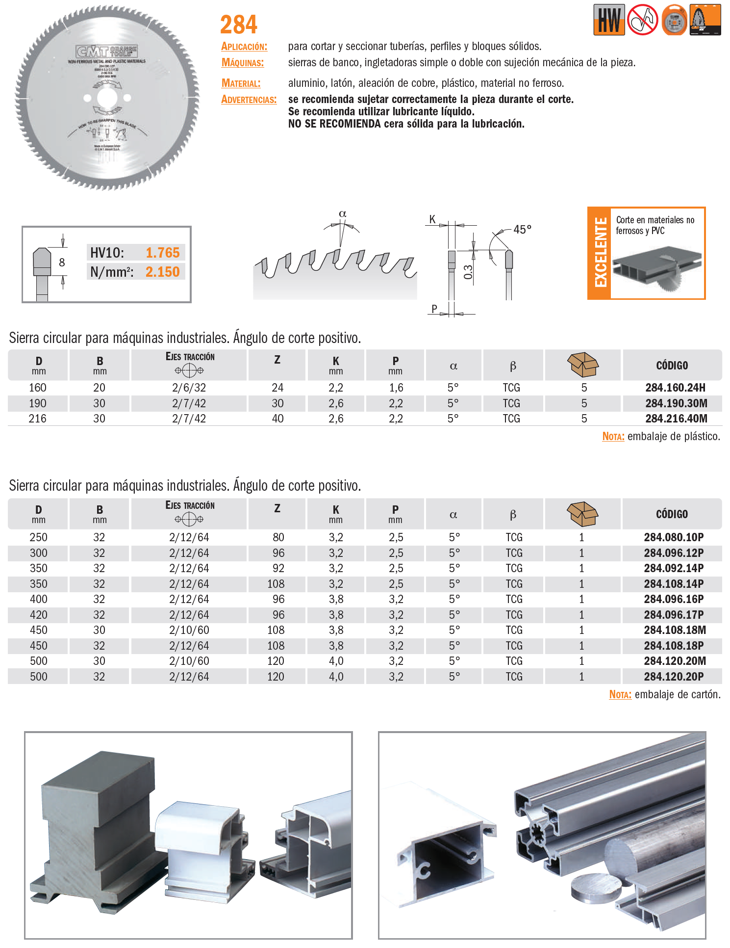 Nota: serras 284.160.24H, 284.190.30M, 284.216.40M em embalagem de plástico.